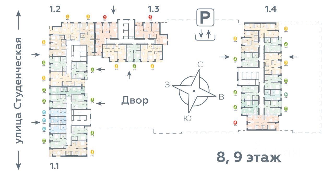 Предусмотрен подземный паркинг и кладовые. Срок сдачи 3 квартал 2026 г.