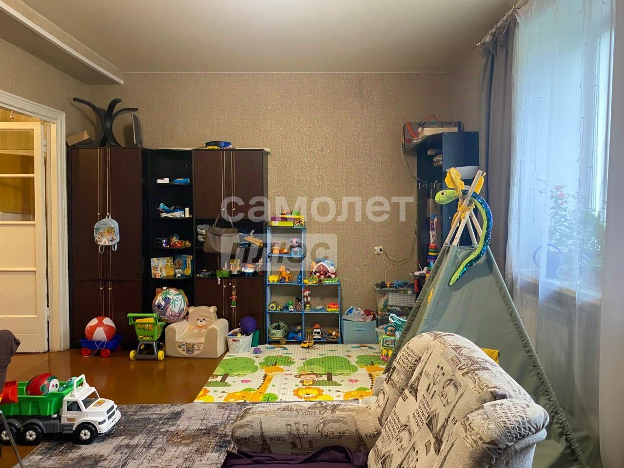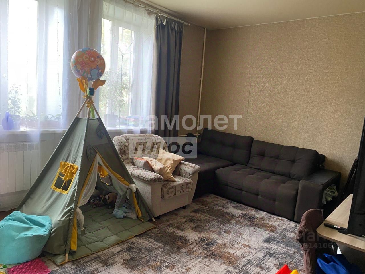 Изначально это была 4 комнатная квартира. Сделана небольшая перепланировка. Убрана не несущая стена между двумя комнатами. В результате получена 1 большая комната из двух с двумя большими окнами.