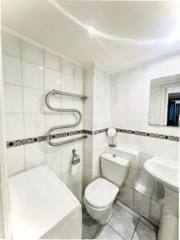Сан узел совмещенный , отделанный кафелем, установлена добротная чугунная ванна.