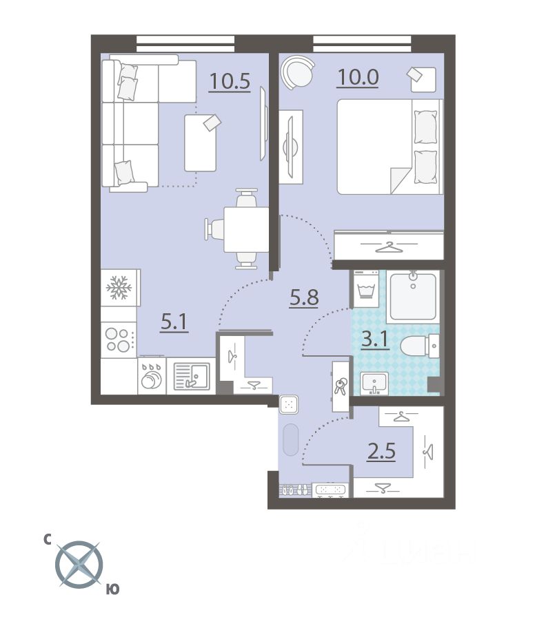 Жилая площадь 20.5 м2, кухня 5.1 м2, чистовая отделка. Раздельных санузлов - нет, балконов - нет, лоджий - нет.