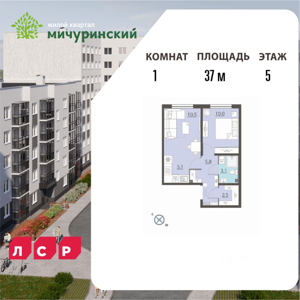 Квартира располагается на 5 этаже 8-этажного дома в ЖК Мичуринский.