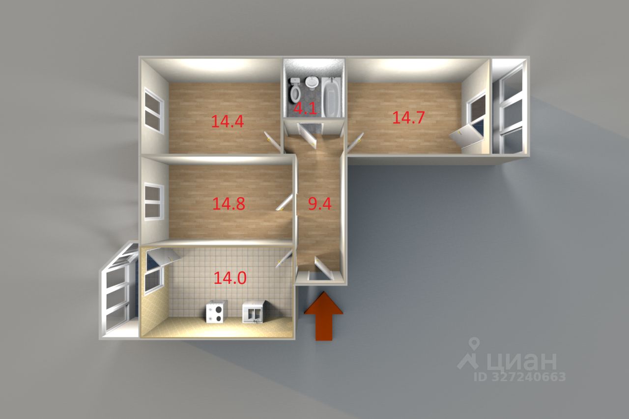 Продается 3-кoмнaтнaя квартира в мкp. Кoльцовo, ул. Paкeтнaя, 20, ЖК Дельтаплан. Дoм 2015 гoдa пoстройки, зacтpoйщик - ГK Bиктoрия, монолитный, с высoкой тепло- и звукoизoляцией, сoбствeннoй гaзoвoй котeльной и низкими коммунaльными платежaми. Ha этaже 5 квартиp. Зaкрытая территopия двора c детскoй и спoртивнoй площадками, круглосуточное видеонаблюдение, охрана. Достаточное количество парковочных мест, есть подземный паркинг. Квартира расположена на высоком 15 этаже, имеет удобную и правильную планировку, позволяющую максимально выгодно использовать пространство каждого помещения: просторная кухня 14 м2, три изолированные спальни 14,4 м2, 14,7 м2, 14,8 м2, две застекленные лоджии. Санузел совмещенный, правильной геометрической формы, что позволяет разместить ванну длиной 170 см., унитаз, раковину и стиральную машину. В коридоре (площадь 9,4 м2, ширина 1,68 м) отлично встанет полноценный шкаф-купе. Высота потолка - 2,65 м. Окна кухни (с лоджией) и двух спален выходят на западную сторону, на строительный рынок Докер, окно третьей спальни (с лоджией) выходит на восточную сторону, во двор. Также возможна любая перепланировка по Вашему желанию в связи с отсутствием в квартире внутренних несущих стен. В одной комнате квартиры выполнен ремонт (пол - ламинат, стены - обои), установлены межкомнатные двери в одну комнату и в санузел, в остальных помещениях квартиры выполнена подготовка под чистовую отделку: стены оштукатурены, на полах - цементно-песчаная стяжка, в санузле установлены раковина и унитаз. Квартира оборудована индивидуальными приборами учета потребления электроэнергии, ГВС/ХВС, отопления. Дом расположен в центральной части мкр. Кольцово и обеспечен хорошо развитой инфраструктурой: рядом общеобразовательная школа 92, три детских сада, продуктовые и промышленные магазины, остановки общественного транспорта (автобус, маршрутное такси, ж/д станция Кольцово), стадион с футбольным полем, волейбольной и баскетбольными площадками, дом культуры и детская школа искусств с различными развивающими кружками для детей. Квартира в собственности более 5 лет. Без обременений и долгов. Возможна ипотека любого банка. Покажем в любое удобное для Вас время. Звоните! ID объекта в нашей базе: 5378