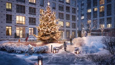 Символические ворота новой очереди Академического — самого молодого и яркого района Екатеринбурга. Лента воды и фасад из красного кирпича напомнят о заводе-крепости, стоявшему ниже по течению реки Патрушихи.