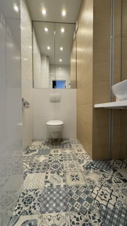 Санузлы: качественная плитка, керамогранит и мозаика. Установлена стильная чугунная ванна с душевой системой и отдельным смесителем. Во всех санузлах — тёплые полы, полотенцесушитель и дополнительная гидроизоляция. Бесперебойную подачу горячей воды обеспечивает бойлер.