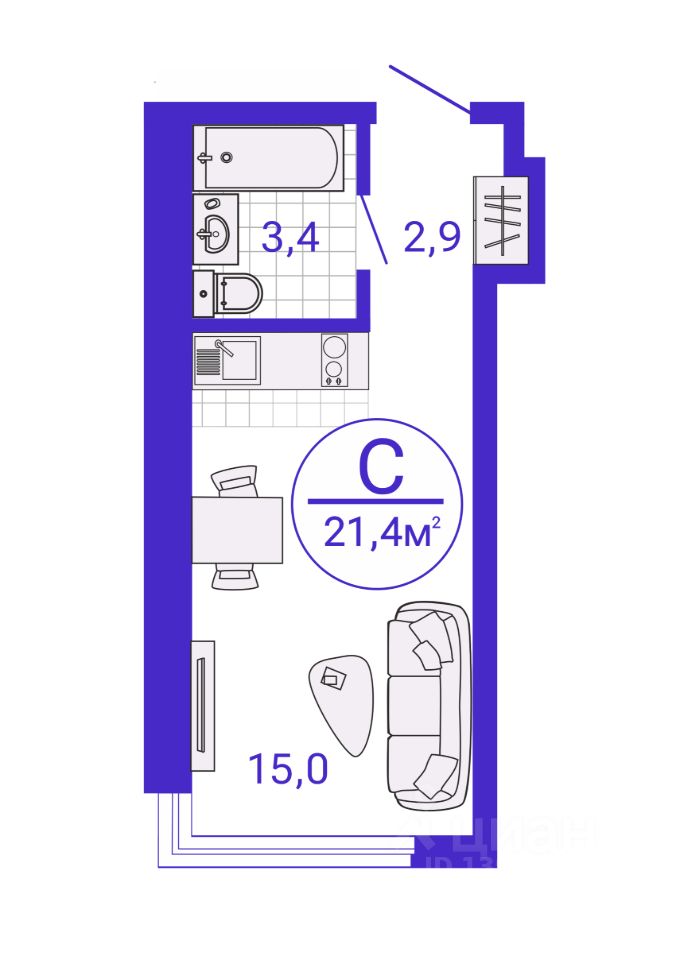 Общая площадь21,35 м²