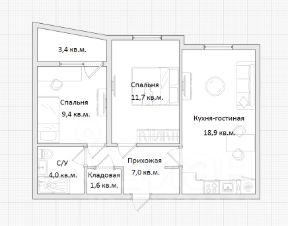 - Удобная планировка (кухня-гостиная 18,9 кв.м., две спальни 11,7 и 9,4 м2, большая гардеробная)