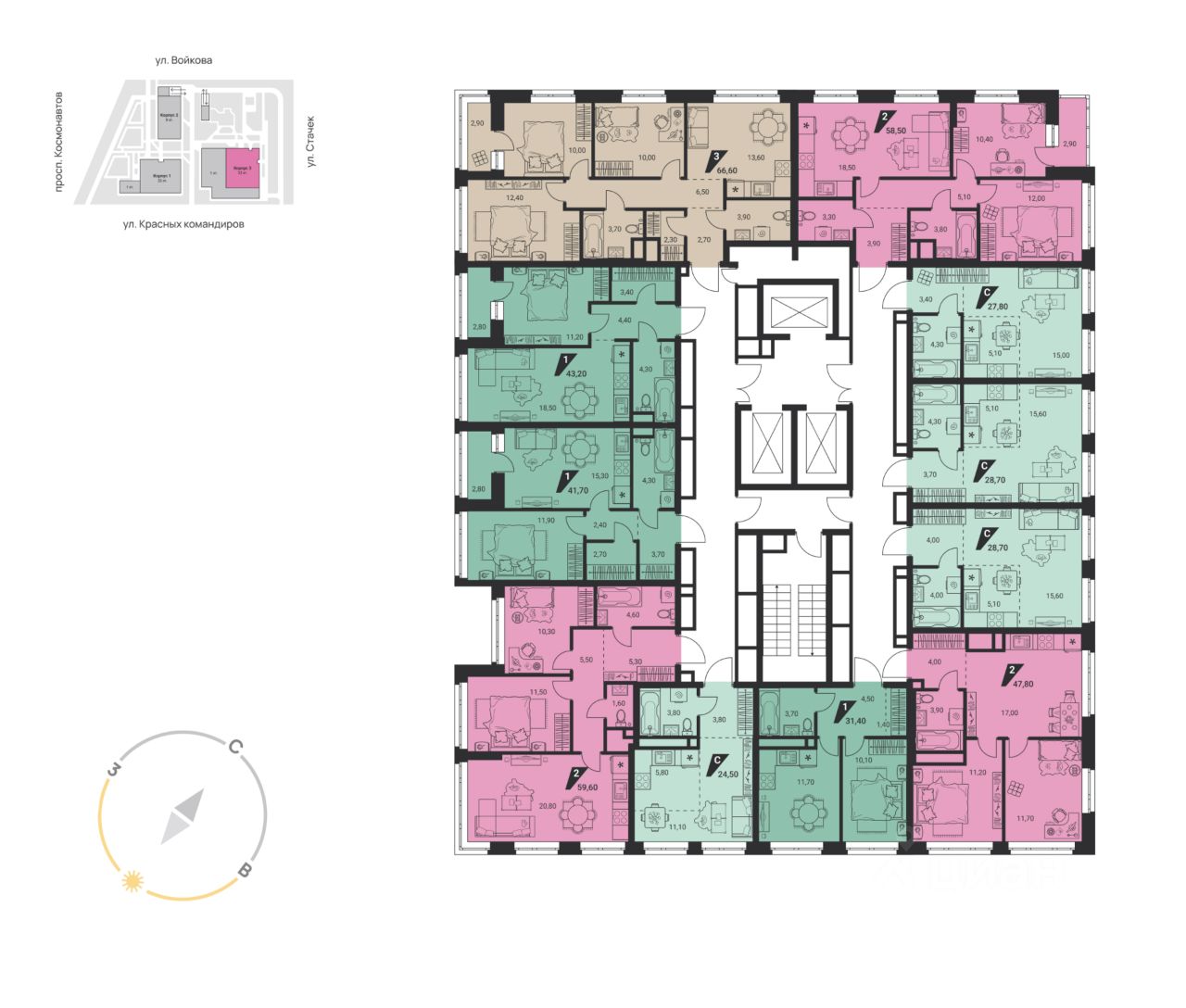 "Квартал К3" находится на перекрестке Космонавтов и Красных Командиров, в 10 минутах от станции метро "Уралмаш". Это три дома высотой от 9 до 26 этажей с благоустроенной территорией, озеленением, детскими и спортивными площадками.