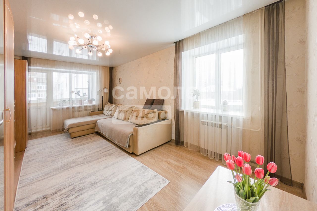 просторная светлая гостиная с двумя окнами (одно выходит на южную сторону — много солнца и тепла!);