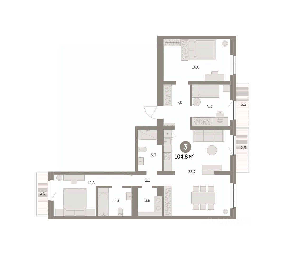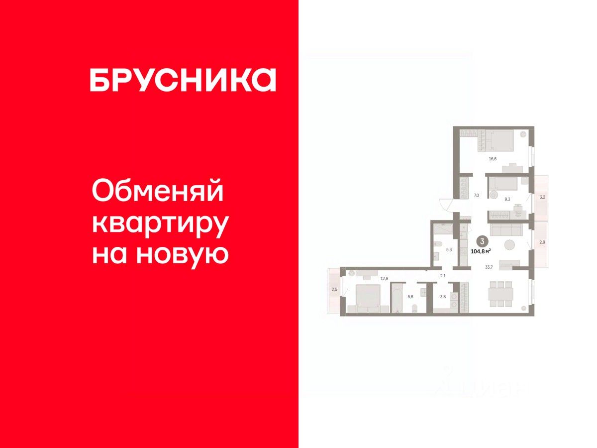 Квартира с кухней-гостиной и тремя спальнями в районе Шишимская горка. Особенности планировки: балкон, вид во двор, второй свет, гардеробная, мастер-спальня, окна на две стороны, постирочная, предчистовая отделка, разнесённые спальни, стартовая цена.