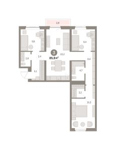 Квартира с кухней-гостиной и тремя спальнями в районе Шишимская горка. Особенности планировки: балкон, вид во двор, второй санузел, гардеробная, окна на две стороны, предчистовая отделка, разнесённые спальни, стартовая цена.