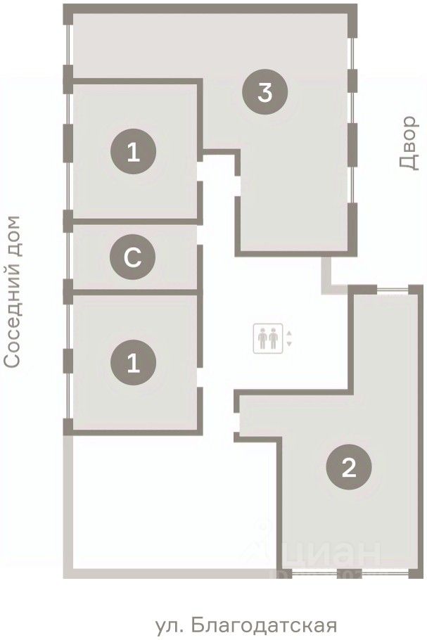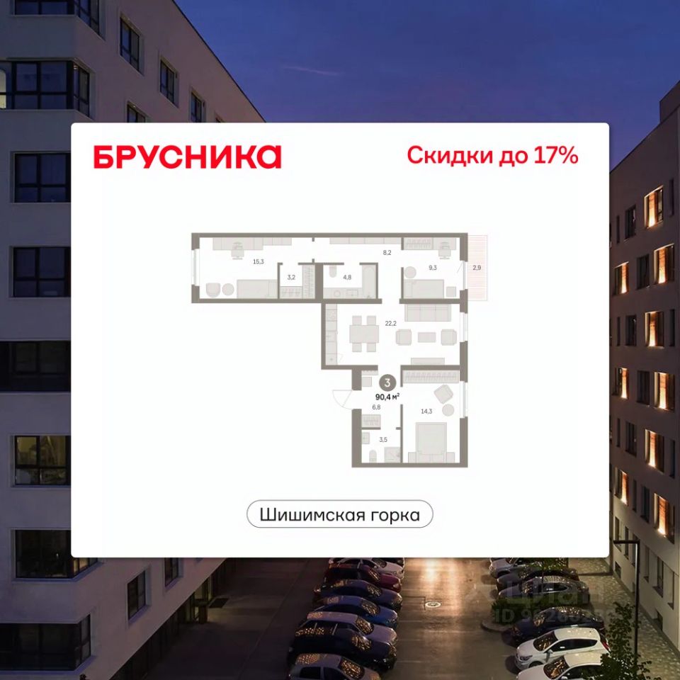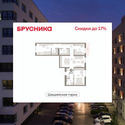 Квартира с кухней-гостиной и тремя спальнями в районе Шишимская горка. Особенности планировки: балкон, вид во двор, второй санузел, гардеробная, окна на две стороны, предчистовая отделка, разнесённые спальни.