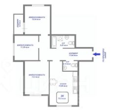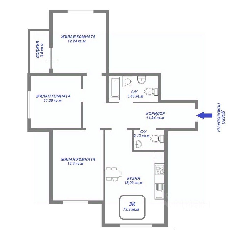 просторная кухня гостиная 18 кв.м., два санузла 5.5 кв.м. и 2 кв.м., спальни 14.4 кв.м, 12.2 кв.м и детская (кабинет) 11.3 кв.м.
