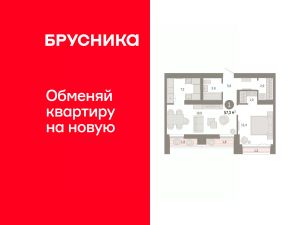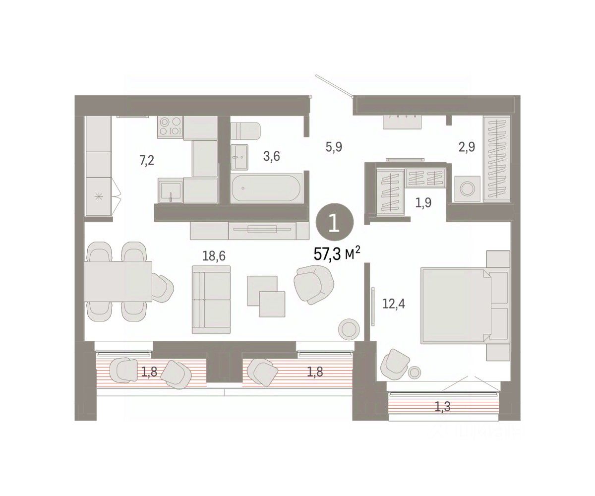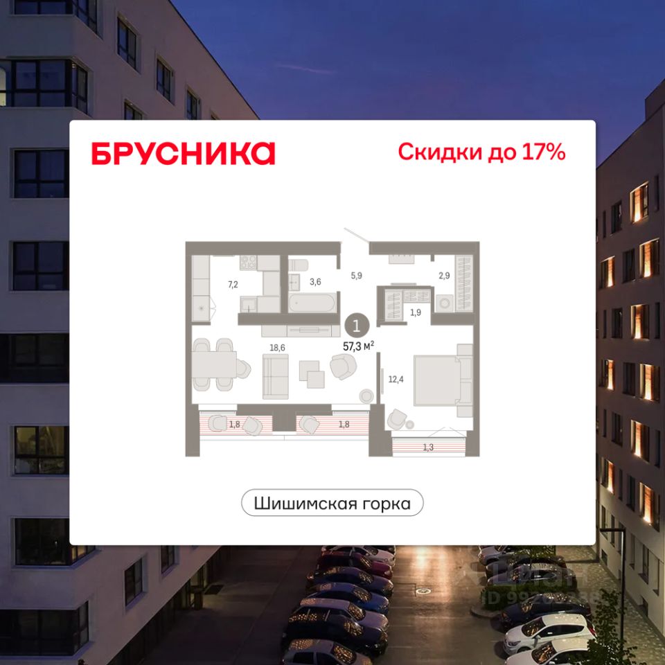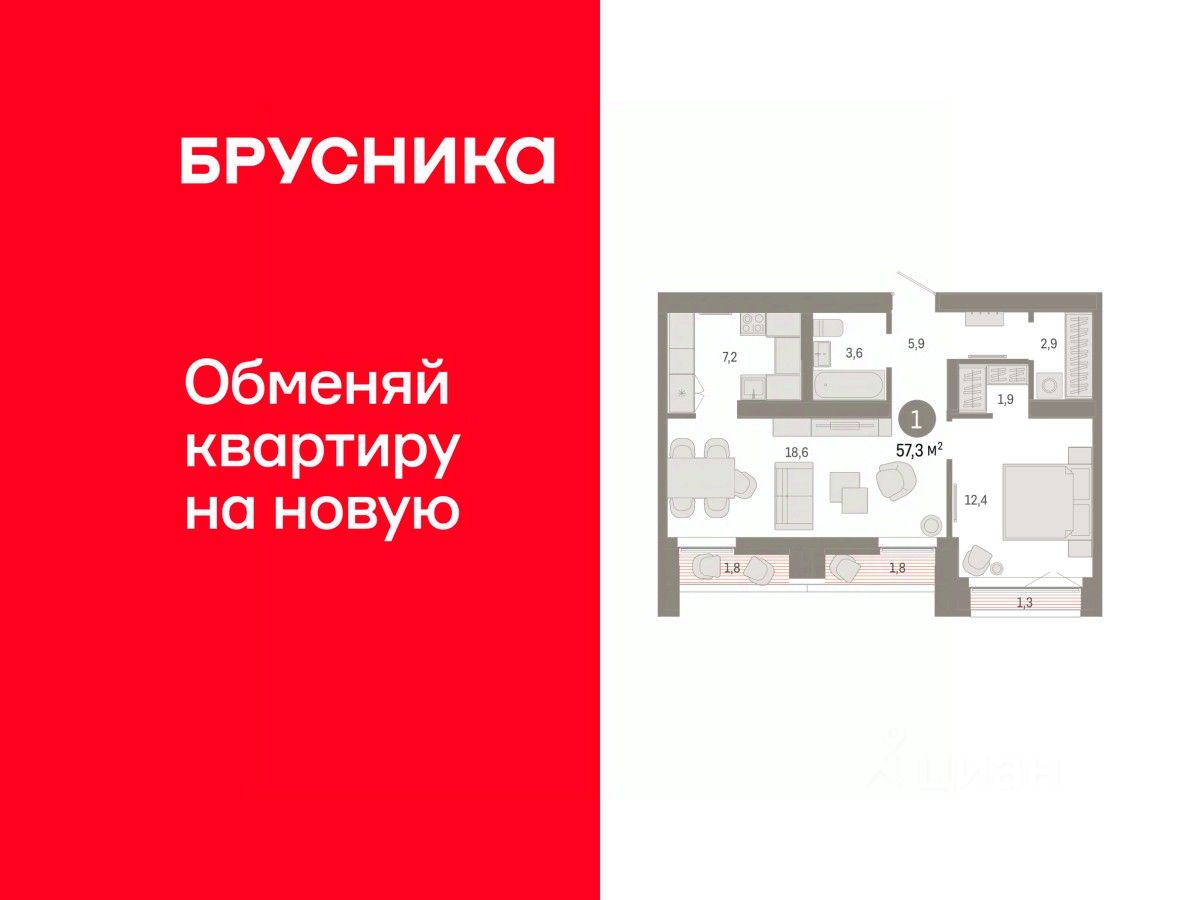 Квартира с кухней-гостиной и одной спальней в районе Шишимская горка. Особенности планировки: гардеробная, лоджия, предчистовая отделка.