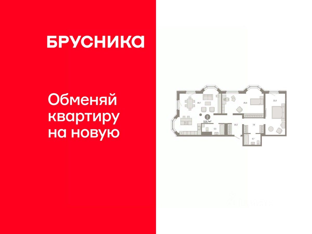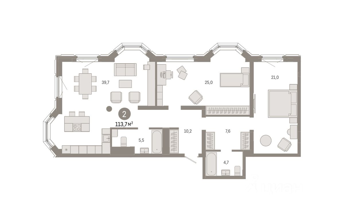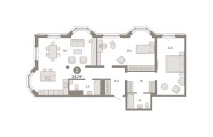 Квартира с кухней-гостиной и двумя спальнями в квартале "На Некрасова". Особенности планировки: второй санузел, мастер-спальня, предчистовая отделка, разнесённые спальни.