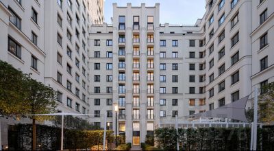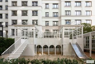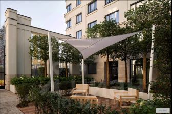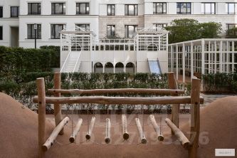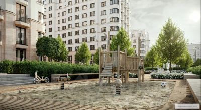 Вход во двор организован через колоннаду. Планировочно он разделён на две части. Парадный партер с большим количеством стриженых растений, фонтанами, цветущими кустарниками и более "домашняя", уютная зона, где высажены деревья и низкорослые хвойные растения, многолетники. В центре двора — две детские площадки. #26egUf