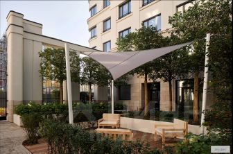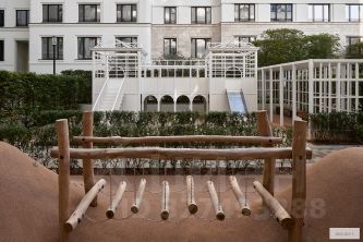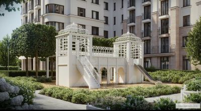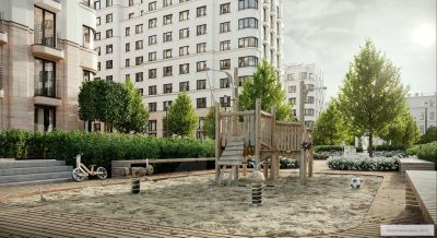 Вход во двор организован через колоннаду. Планировочно он разделён на две части. Парадный партер с большим количеством стриженых растений, фонтанами, цветущими кустарниками и более "домашняя", уютная зона, где высажены деревья и низкорослые хвойные растения, многолетники. В центре двора — две детские площадки. #Z6e9W1