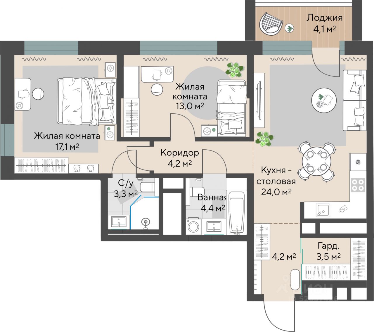 Продаётся 2-комнатная квартира в строящемся доме (Дом 2 этап 1.2), срок сдачи: I-кв. 2028, общей площадью 75.8 кв.м., на 15 этаже.
