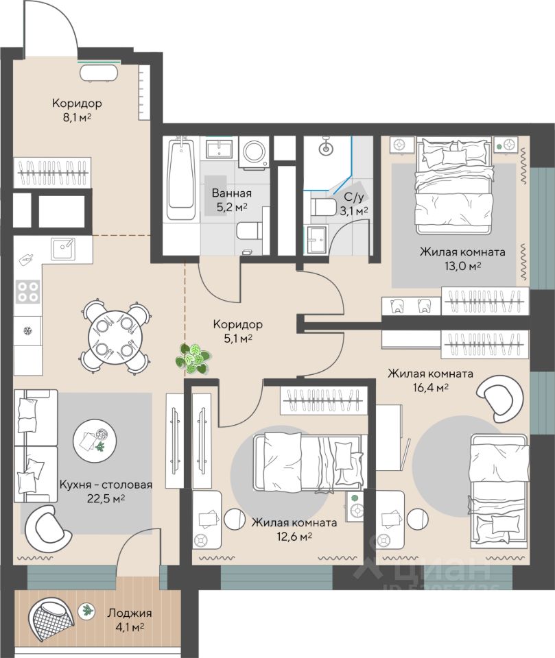 Продаётся 3-комнатная квартира в строящемся доме (Дом 2 этап 1.2), срок сдачи: I-кв. 2028, общей площадью 88.1 кв.м., на 5 этаже.