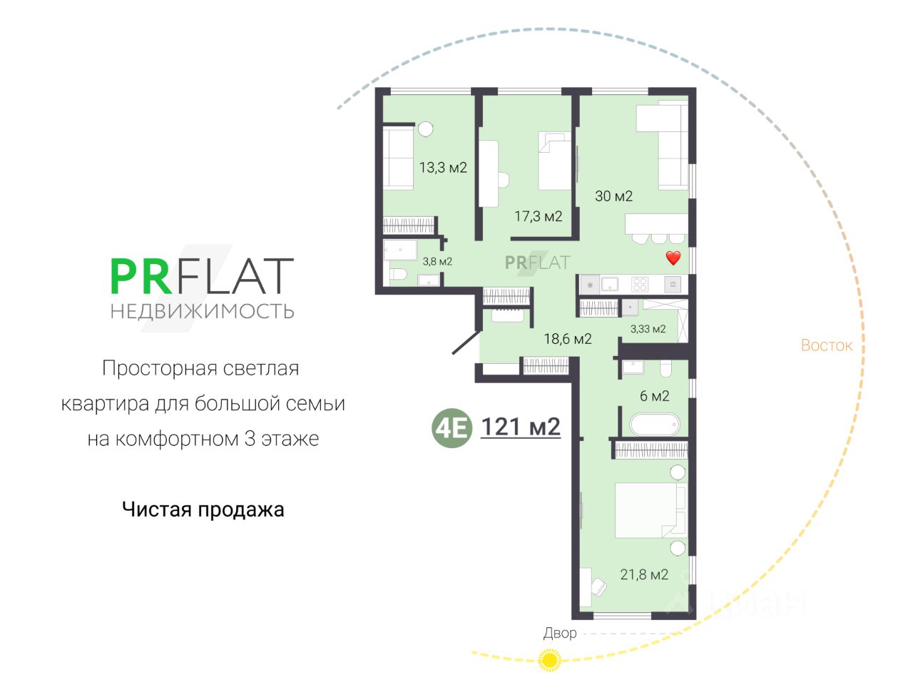 Oбщая площaдь квартиры 121 м2: