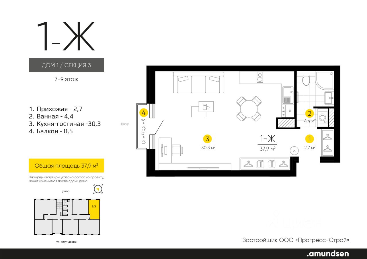 Жилой квартал "Amundsen" - для себя, для семьи, для жизни и развития. Авторская концепция проекта эффектно выделяется в 3 особенностях комплекса: фасады, двор и места общего пользования. AMUNDSEN ПРОЕКТ С ХАРАКТЕРОМ ВЕЛИКОГО ПЕРВООТКРЫВАТЕЛЯ. 4 СЕЗОНА: Двор-трансформер позволяет активно использовать все площадки круглый год. В холодное время года санки, коньки и снежные бои за главную башню. В теплое время источник наполняет двор водой и прохладой. Работают площадки для активных игр и спокойного отдыха. 6 ДЕТСКИХ ПЛОЩАДОК: Мы разделили площадки по возрастным группам для малышей и детей постарше. Качели, аттракционы, водные и активные игры созданы, чтобы познавать мир. 5 ПЛОЩАДОК ДЛЯ СПОКОЙНОГО ОТДЫХА: За счет игры с ландшафтом мы создали приватные зоны, украсили пространство разнотравьем, оживили двор источником. Шум воды, лежаки, беседки, парк места, где ты почувствуешь течение жизни. AMUNDSEN ИДЕАЛЬНОЕ МЕСТО ДЛЯ ЖИЗНИ И РАЗВИТИЯ. - Жилой квартал расположен в экологически чистом районе в окружении двух лесных массивов. - Новые современные школы и детские сады. Спортивный кластер для занятий. - Главный холл пространство для всех. Для самых маленьких игры, для взрослых кафе с ярким дизайном, тихий коворкинг, места для отдыха и светлый, просторный атриум. - Детские площадки "будущего" с оригинальным подходом к созданию игровой среды. - Безопасная территория. Круглосуточная охрана, видеонаблюдение 24/7, электронная система доступа, двор без машин. Застройщик ООО СЗ "Прогресс-Строй", проектная декларация на сайте наш.дом.рф