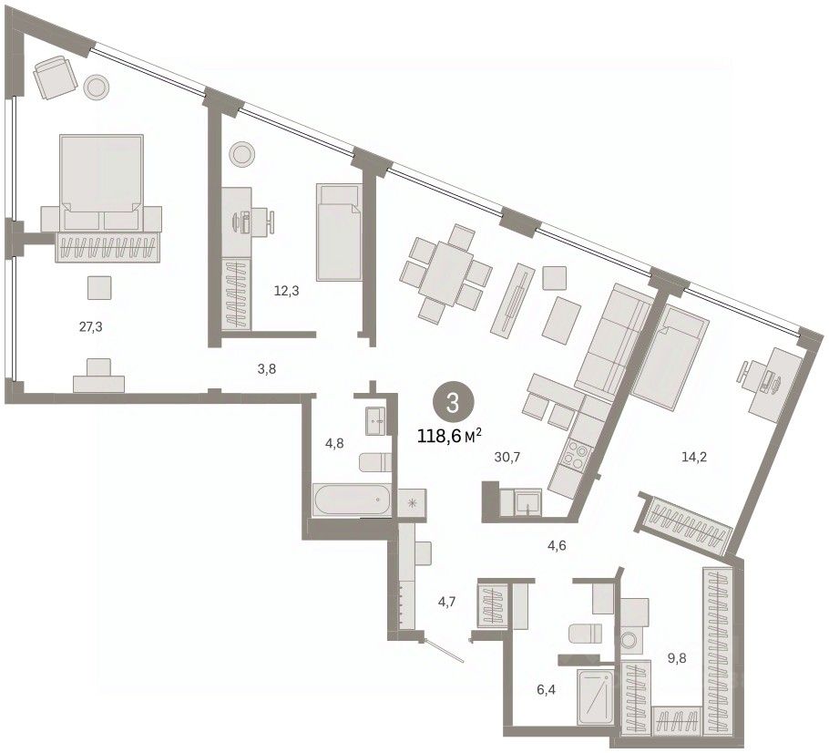 Квартира с кухней-гостиной и тремя спальнями в районе Шишимская горка. Особенности планировки: без отделки, второй санузел, окна в пол, потолки 3 м и выше.