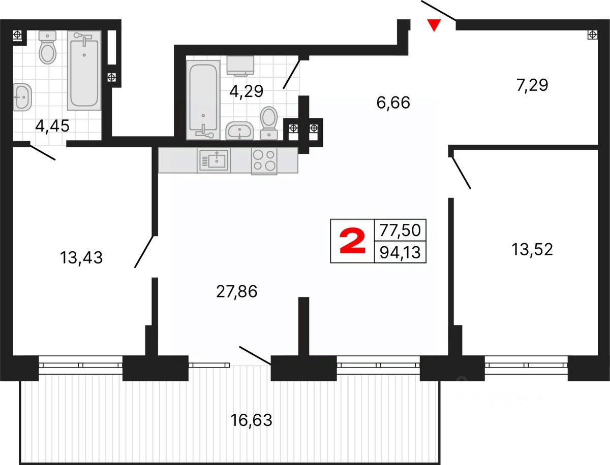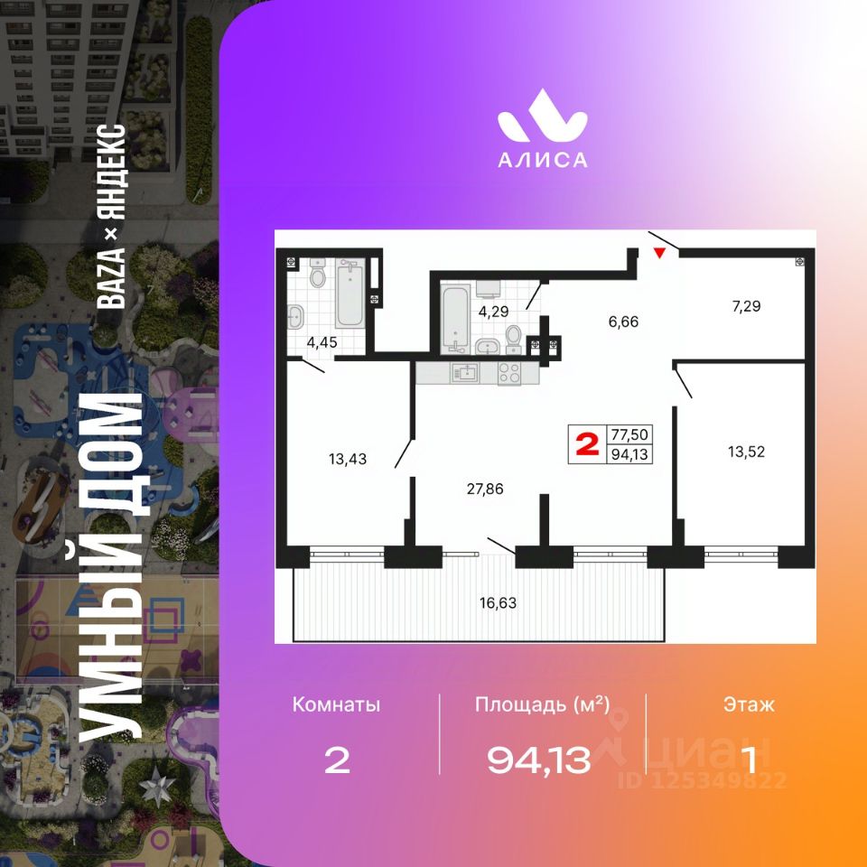 Продается двухкомнатная квартира с предчистовой отделкой в ЖК "Алиса" на 1 этаже. Общая площадь: 94.13 кв.м., жилая: 26.95 кв.м., площадь просторной кухни-столовой: 27.86 кв.м. Комнаты изолированные, все окна выходят на одну сторону. В квартире один балкон, два совмещенных санузла. Наличие в квартире террасы открывает возможность для обустройства дополнительной площади. Высота потолков 2.72 м.