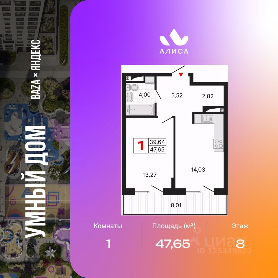 Продается 1-комн. квартира от застройщика с предчистовой отделкой в ЖК "Алиса" на 8 этаже. Общая площадь: 47.65 кв.м., жилая: 13.27 кв.м., площадь просторной кухни-столовой: 14.03 кв.м. Все окна выходят на одну сторону. В квартире два балкона, один совмещенный санузел. Наличие террасы в квартире открывает возможность для создания зон отдыха в кругу семьи и друзей. Высота потолков 2.72 м.