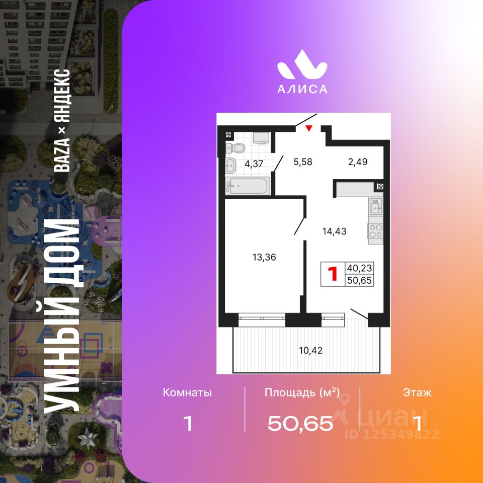1-комн. квартира с предчистовой отделкой в ЖК "Алиса" на 1 этаже. Общая площадь: 50.65 кв.м., жилая: 13.36 кв.м., площадь просторной кухни-столовой: 14.43 кв.м. Все окна выходят на одну сторону. В квартире два балкона, один совмещенный санузел. Наличие в квартире террасы открывает возможность для создания зон отдыха в кругу семьи и друзей. Высота потолков 2.72 м.