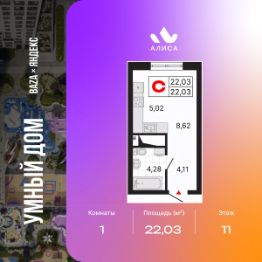 1-комн. квартира-студия от застройщика с предчистовой отделкой в ЖК "Алиса" на 11 этаже. Общая площадь: 22.03 кв.м., площадь гостиной 13.64 кв.м., из которых 5.02 кв.м. выделено под кухонную зону. Все окна выходят на одну сторону. В квартире один совмещенный санузел. Высота потолков 2.72 м.