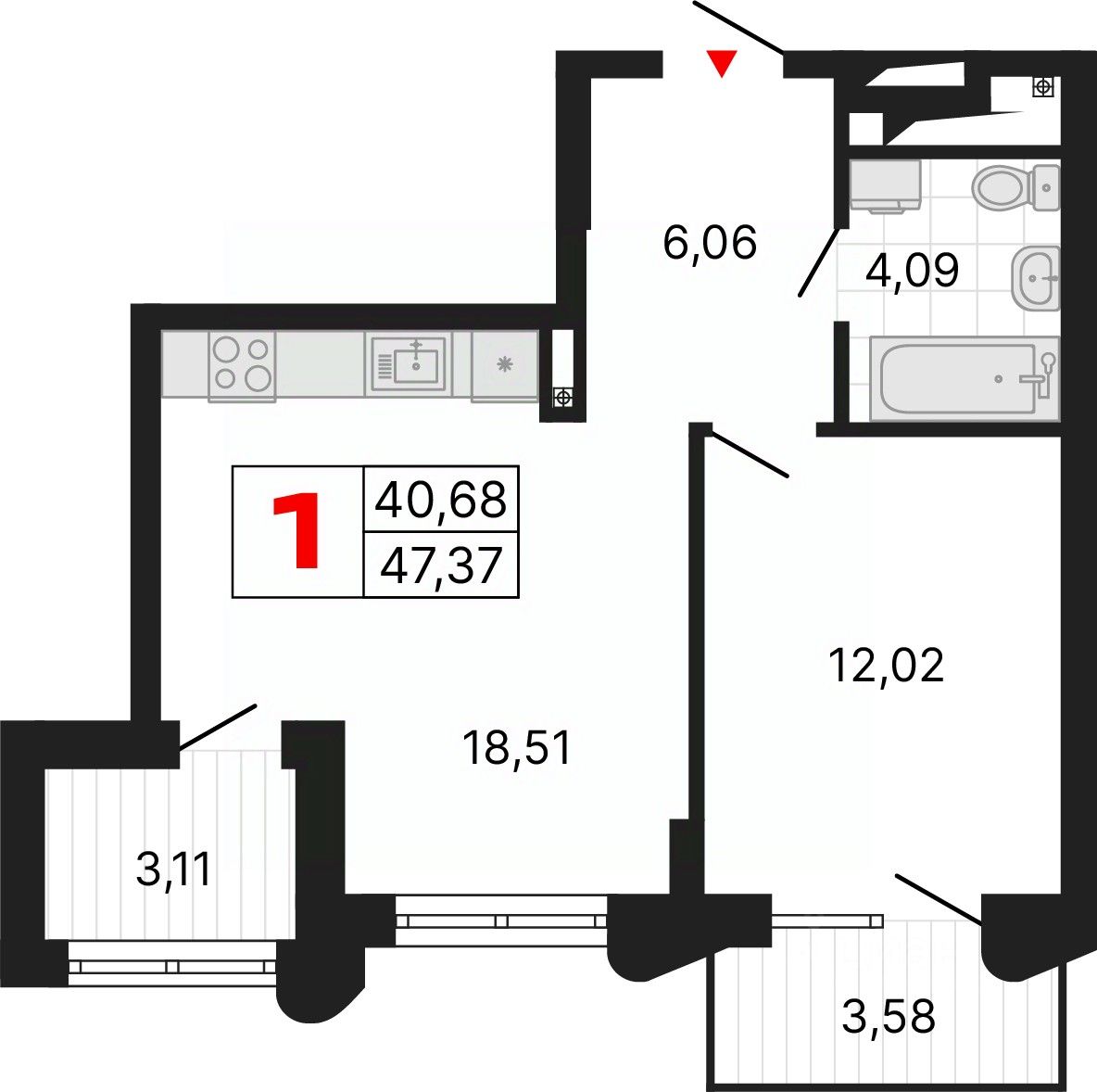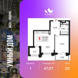 Продается однокомнатная квартира от застройщика с предчистовой отделкой в ЖК "Алиса" на 22 этаже. Общая площадь: 47.37 кв.м., жилая: 12.02 кв.м., площадь просторной кухни-столовой: 18.51 кв.м. Все окна выходят на одну сторону. В квартире один балкон и одна лоджия, один совмещенный санузел. Высота потолков 2.72 м.