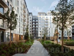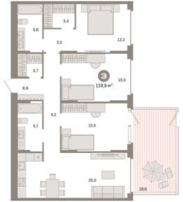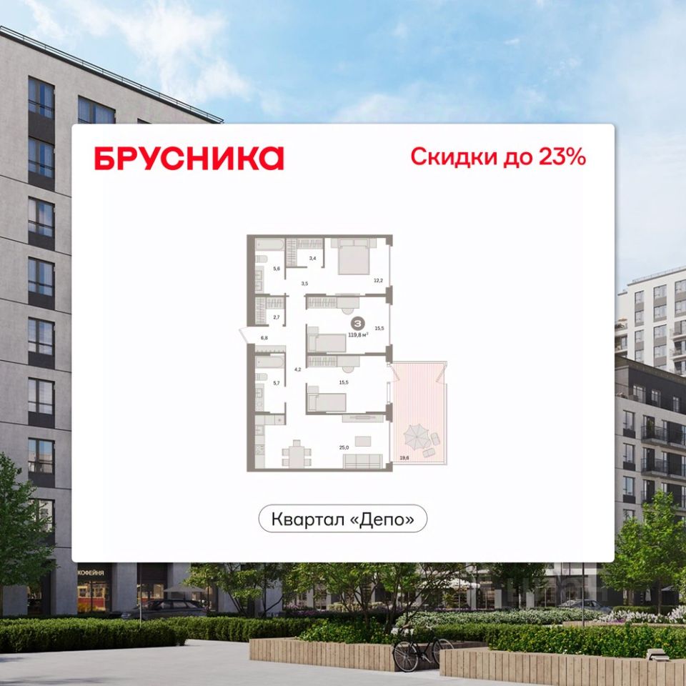 Квартира с кухней-гостиной и тремя спальнями в квартале "Депо". Особенности планировки: вид во двор, второй санузел, гардеробная, мастер-спальня, окна в пол, панорамное остекление, предчистовая отделка, терраса.