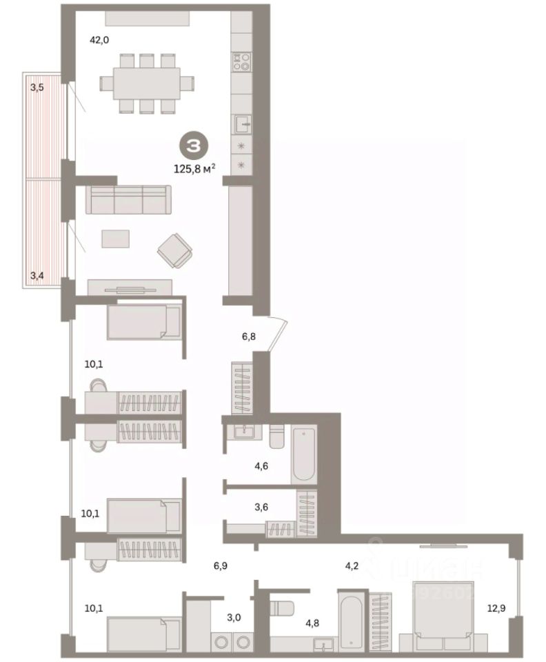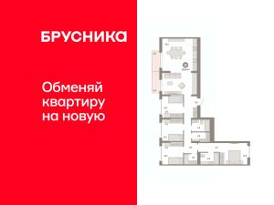 Квартира с кухней-гостиной и четырьмя спальнями в квартале "Депо". Особенности планировки: балкон, вид во двор, гардеробная, мастер-спальня, окна на две стороны, постирочная, предчистовая отделка, рабочий кабинет, разнесённые спальни.