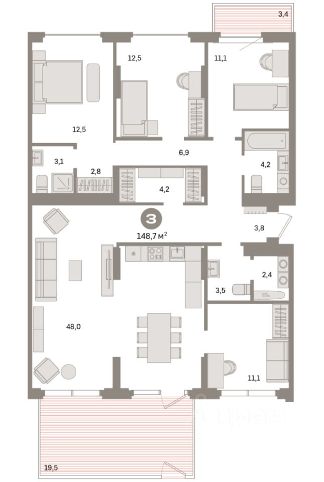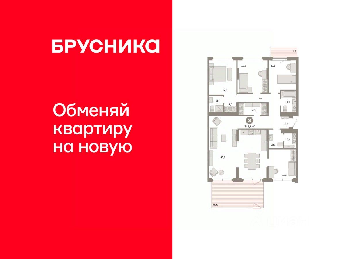 Квартира с кухней-гостиной и тремя спальнями в квартале "Депо". Особенности планировки: балкон, вид во двор, второй санузел, гардеробная, мастер-спальня, окна в пол, окна на две стороны, панорамное остекление, постирочная, предчистовая отделка, рабочий кабинет, терраса.