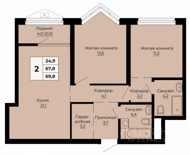Продаётся 2-комнатная квартира в строящемся доме (Дом 2), срок сдачи: II-кв. 2026, общей площадью 69.8 кв.м., на 13 этаже.