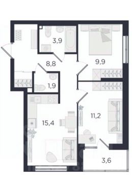 Пространство: Четкое зонирование на приватную зону (две спальни) и публичную (светлая кухня-гостиная).