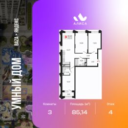 Продается 3-комн. квартира от застройщика с предчистовой отделкой в ЖК "Алиса" на 4 этаже. Общая площадь: 85.14 кв.м., жилая: 41.47 кв.м., площадь просторной кухни-столовой: 22.57 кв.м. Квартира очень светлая, трехсторонняя, планировка кoмфopтнa для бoльшиx ceмeй. В квартире один балкон, два совмещенных санузла. Высота потолков 2.72 м.