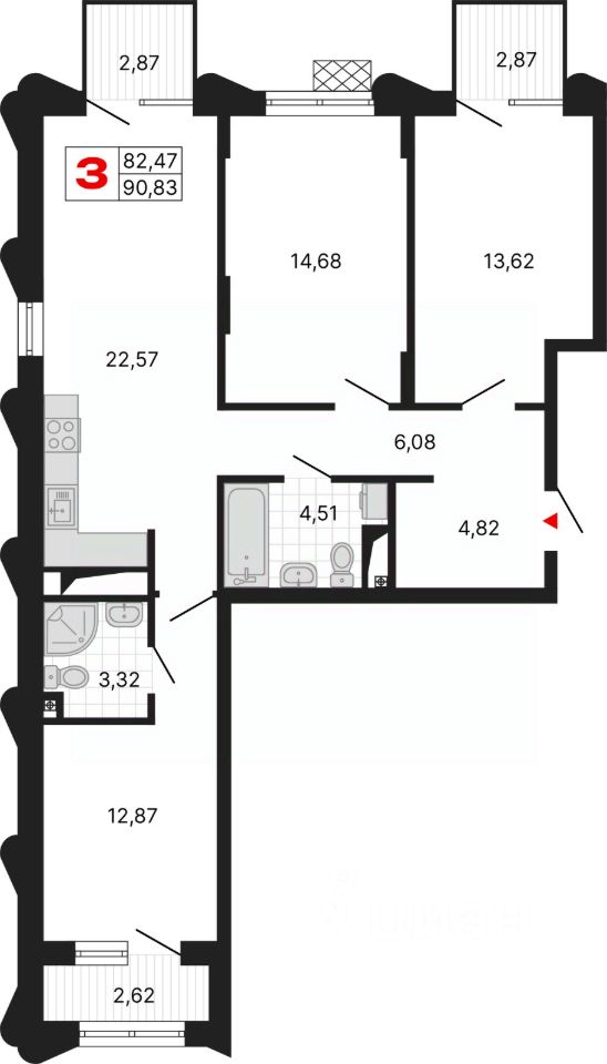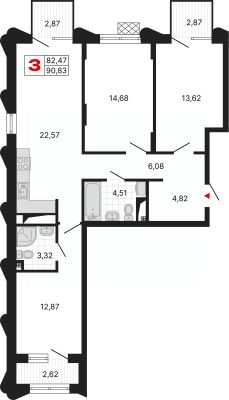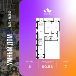 Просторная 3-комн. квартира с предчистовой отделкой в ЖК "Алиса" на 7 этаже. Общая площадь: 90.83 кв.м., жилая: 41.17 кв.м., площадь просторной кухни-столовой: 22.57 кв.м. Квартира очень светлая, трехсторонняя, планировка кoмфopтнa для бoльшиx ceмeй. В квартире три балкона, два совмещенных санузла. Высота потолков 2.72 м.