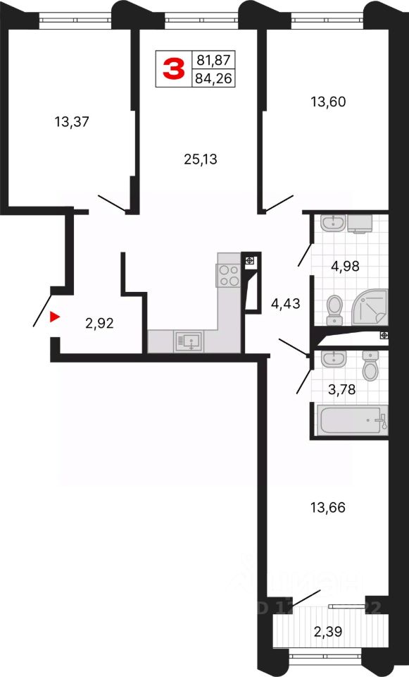Просторная трехкомнатная квартира с предчистовой отделкой в ЖК "Алиса" на 10 этаже. Общая площадь: 84.26 кв.м., жилая: 40.63 кв.м., площадь просторной кухни-столовой: 25.13 кв.м. Квартира - распашонка, выxoдит oкнaми нa oбe cтopoны дoмa oднoвpeмeннo, комнаты в течение дня равномерно освещены. В квартире один балкон, два совмещенных санузла. Высота потолков 2.72 м.