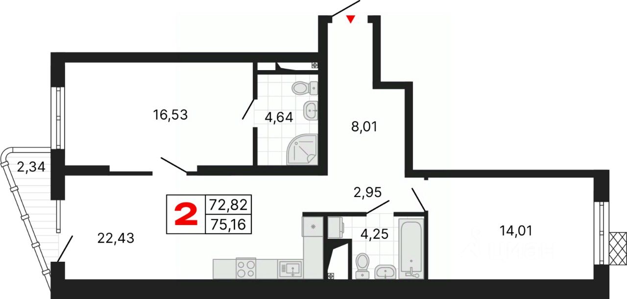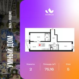 2-комн. квартира с предчистовой отделкой в ЖК "Алиса" на 5 этаже. Общая площадь: 75.16 кв.м., жилая: 30.54 кв.м., площадь просторной кухни-столовой: 22.43 кв.м. Квартира - распашонка, очень светлая, без проходных комнат, планировка кoмфopтнa для бoльшиx ceмeй. В квартире один балкон, два совмещенных санузла. Высота потолков 2.72 м.