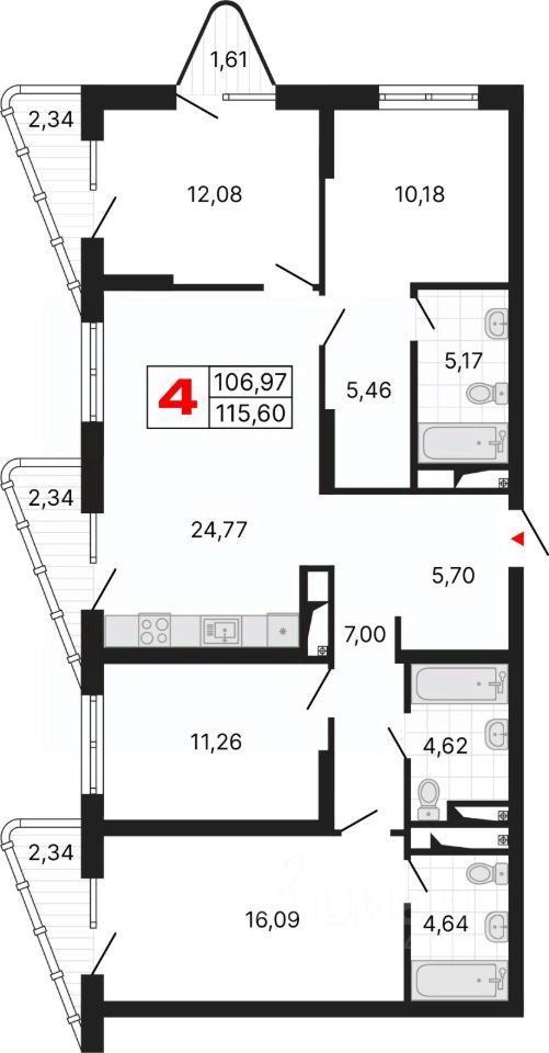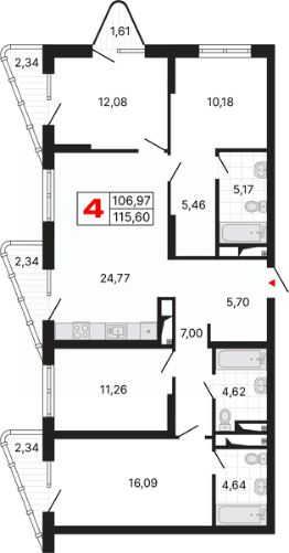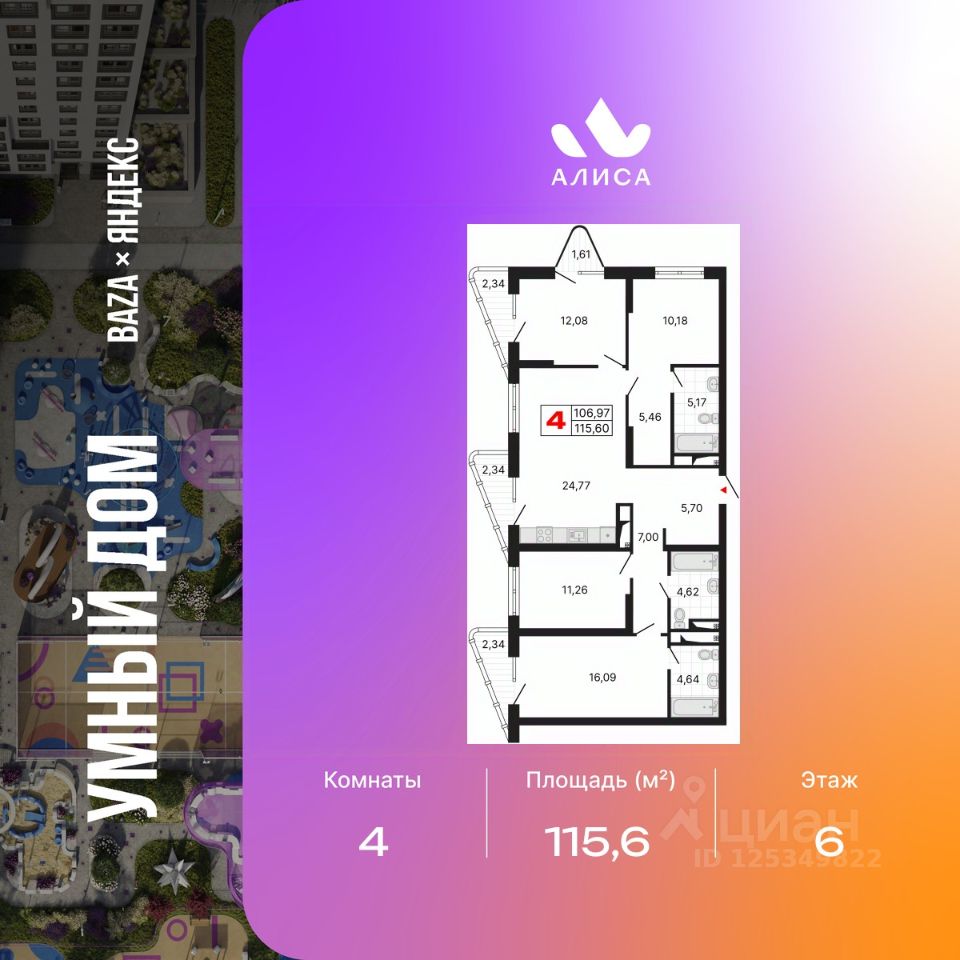 Четырехкомнатная квартира от застройщика с предчистовой отделкой в ЖК "Алиса" на 6 этаже. Общая площадь: 115.6 кв.м., жилая: 49.61 кв.м., площадь просторной кухни-столовой: 24.77 кв.м. Угловая квартира, идеально подойдет любителям тишины и панорамных видов. В квартире четыре балкона, три совмещенных санузла. Высота потолков 2.72 м.