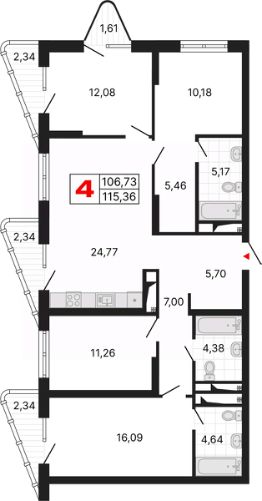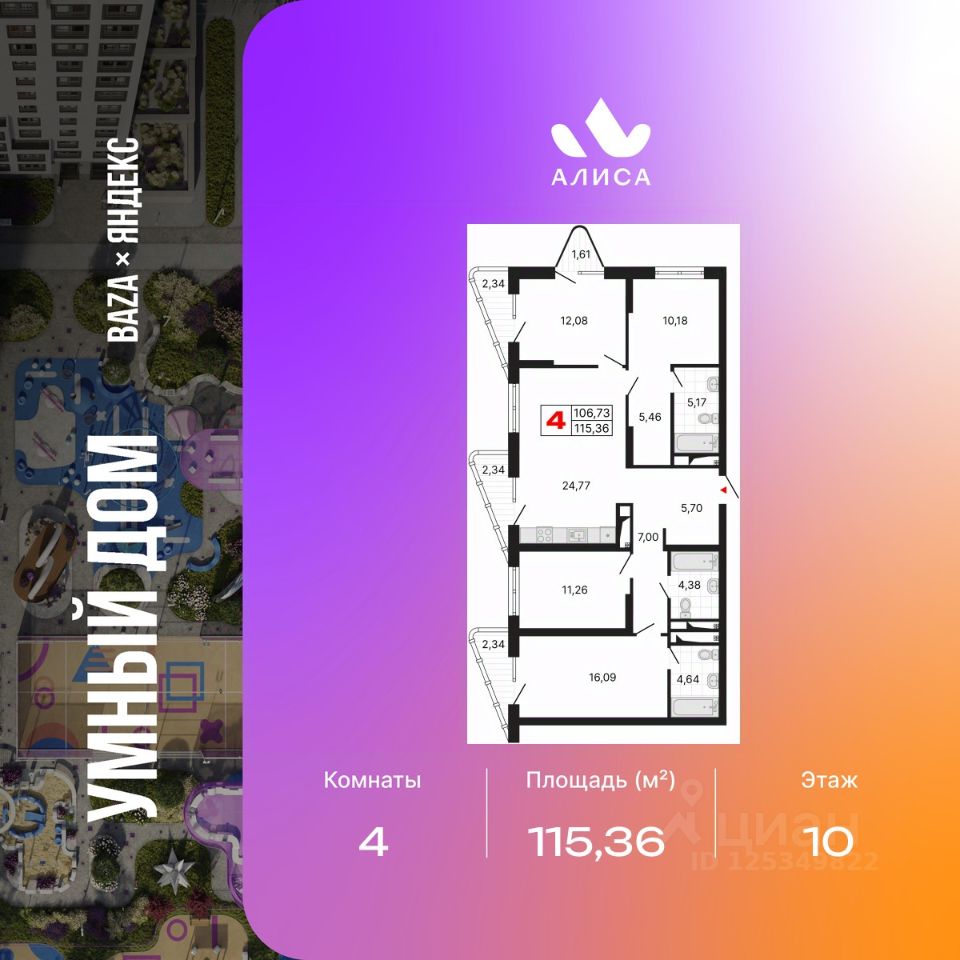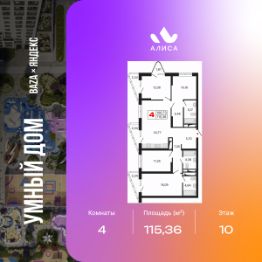 Четырехкомнатная квартира от застройщика с предчистовой отделкой в ЖК "Алиса" на 10 этаже. Общая площадь: 115.36 кв.м., жилая: 49.61 кв.м., площадь просторной кухни-столовой: 24.77 кв.м. Угловая квартира, окна oбecпeчивaют paвнoмepнoe ocвeщeниe в тeчeниe дня. В квартире четыре балкона, три совмещенных санузла. Высота потолков 2.72 м.