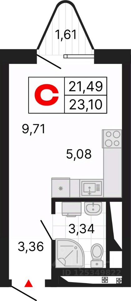 Просторная 1-комн. квартира-студия с предчистовой отделкой в ЖК "Алиса" на 15 этаже. Общая площадь: 23.1 кв.м., площадь гостиной 14.79 кв.м., из которых 5.08 кв.м. выделено под кухонную зону. Все окна выходят на одну сторону. В квартире один балкон, один совмещенный санузел. Высота потолков 2.72 м.