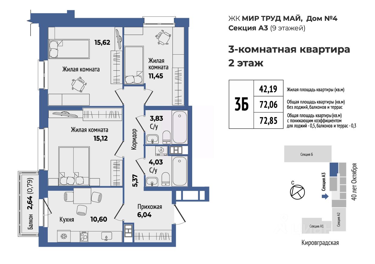 Продаётся 3-комнатная квартира в сданном доме (40-летия Октября, 33 (Дом 4 секция А)), срок сдачи: II-кв. 2025, общей площадью 72.9 кв.м., на 2 этаже. Жилой комплекс "Мир Труд Май" - современные дома под лозунгом традиций. Уютный квартал в самом сердце Уралмаша - в квадрате улиц 40 лет Октября - Кировградская - Ломоносова - Калинина. Выполняется застройка разной этажности, которая состоит из четырех многоквартирных домов с частными дворами, подземным паркингом с кладовыми.