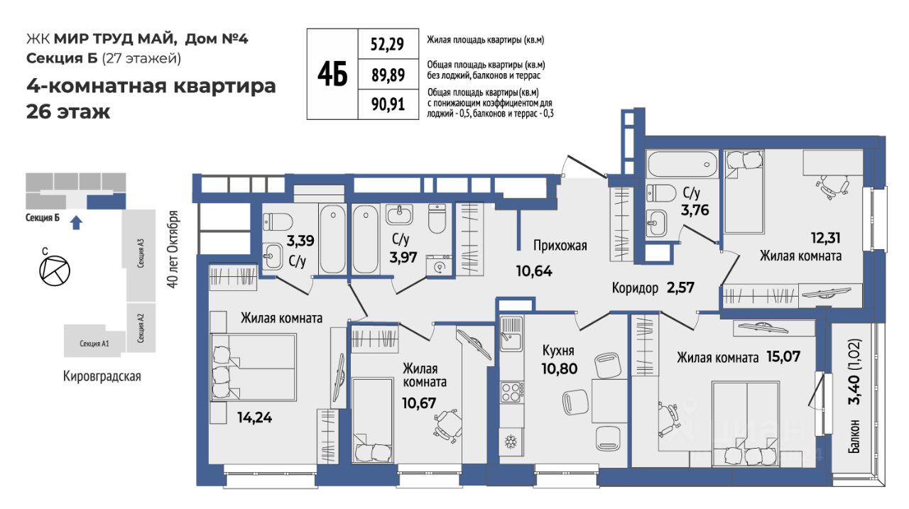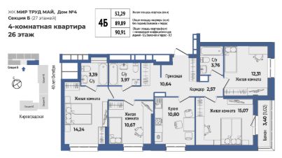 Продаётся 4-комнатная квартира в сданном доме (40-летия Октября, 33 (Дом 4 секция Б)), срок сдачи: I-кв. 2026, общей площадью 89 кв.м., на 26 этаже. Жилой комплекс "Мир Труд Май" - современные дома под лозунгом традиций. Уютный квартал в самом сердце Уралмаша - в квадрате улиц 40 лет Октября - Кировградская - Ломоносова - Калинина. Выполняется застройка разной этажности, которая состоит из четырех многоквартирных домов с частными дворами, подземным паркингом с кладовыми.