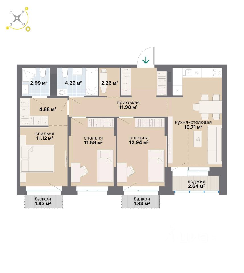 Продаётся 3-комнатная квартира в строящемся доме (18Б), срок сдачи: III-кв. 2026, общей площадью 88.06 кв.м., на 7 этаже. Расположение, транспортная доступность
