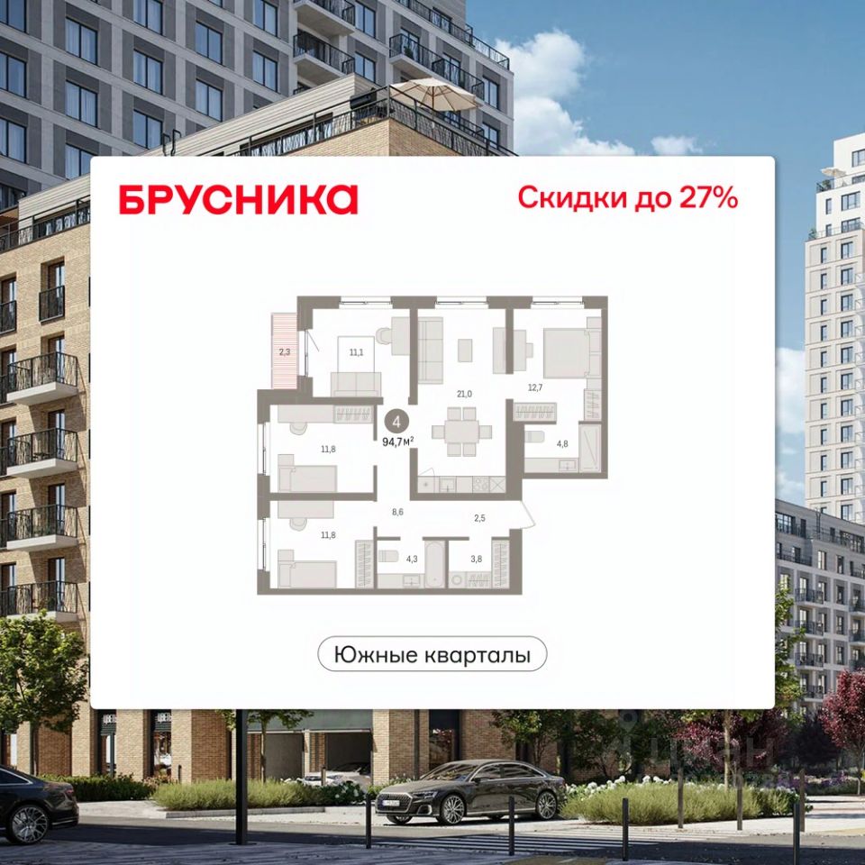 Квартира с кухней-гостиной и четырьмя спальнями в Южных кварталах. Особенности планировки: балкон, гардеробная, мастер-спальня, предчистовая отделка, разнесённые спальни.