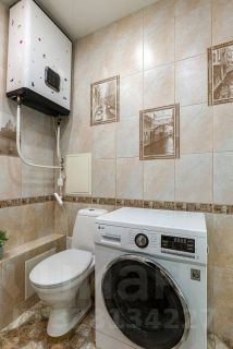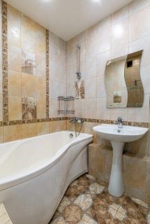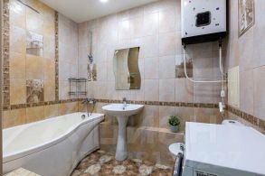 В санузле керамогранит, установлена большая ванна, бойлер.