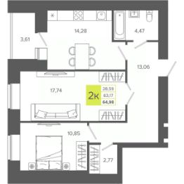 Продаётся 2-комнатная квартира в строящемся доме (Дом 1), срок сдачи: II-кв. 2026, общей площадью 64.98 кв.м., на 2 этаже. Новый жилой дом от Специализированного застройщика "ПушкинЪ" расположен в г. Каменск-Уральский Свердловской области на ул. Советская.