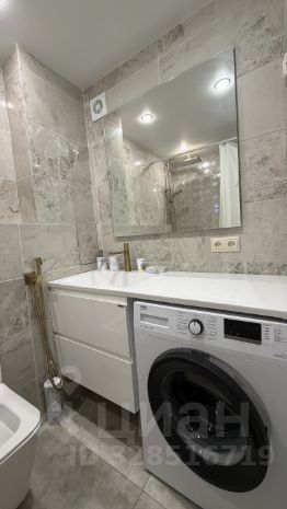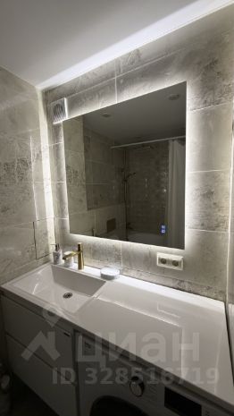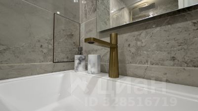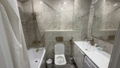 Скрытый монтаж счетчиков, сантехника европейская под заказ. Санузел совмещенный, дизайнерская плитка. Раковина-столешница цельная из камня. Зеркало с подсветкой и антизапотевающей системой. Электрическая вытяжка в ванной.