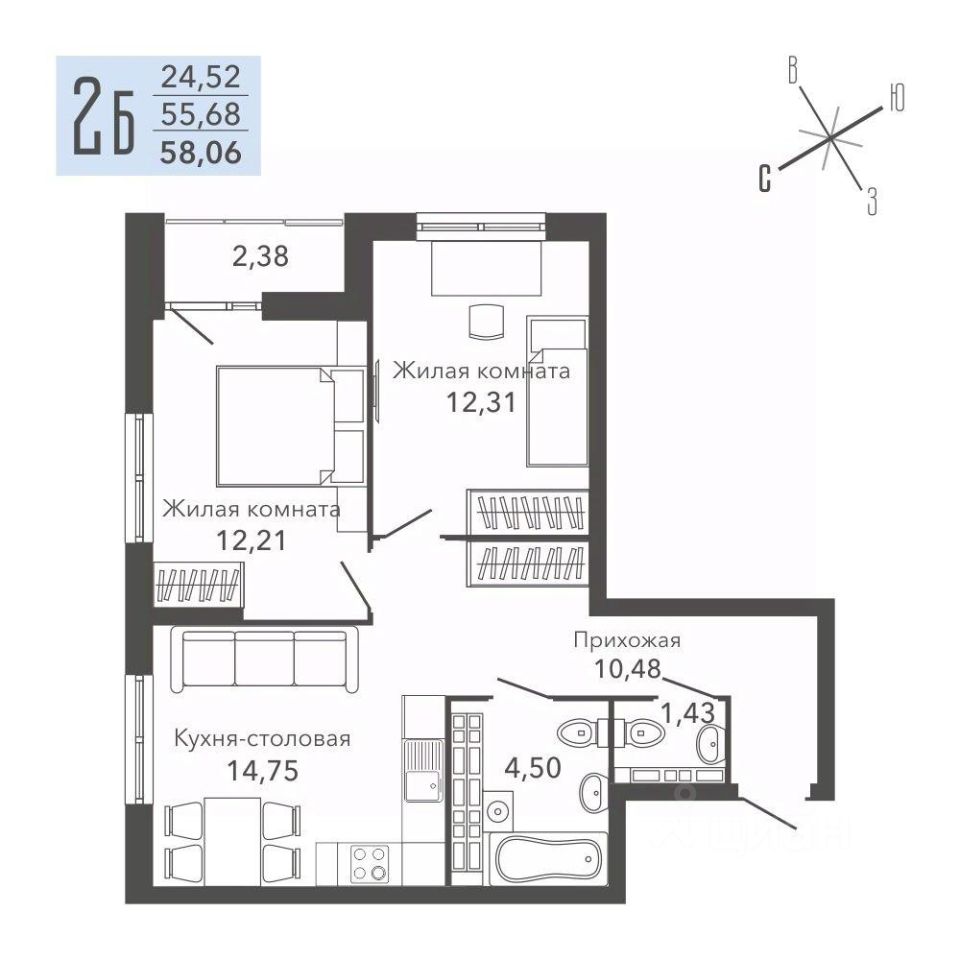 Общая площадь57,6 м²